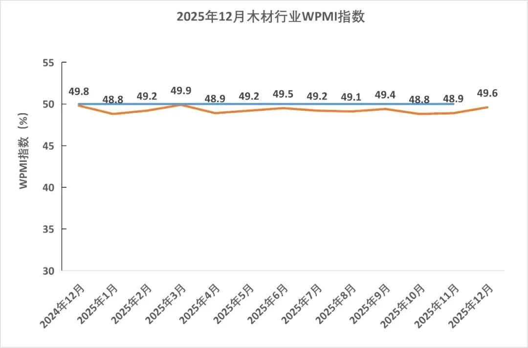 中国木材保护工业协会发布的2025年12月木材行业采购经理指数(WPMI)为49.6%,较上月48.9%上升0.7个百分点,表明木材行业经济运行延续收缩态势但边际改善,市场需求出现积极信号但整体仍面临压力。