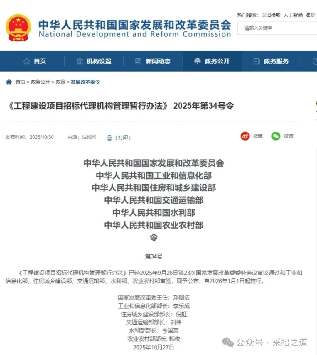 近日,国家发展改革委联合工业和信息化部、住房城乡建设部、交通运输部、水利部、农业农村部等部门,正式印发 《工程建设项目招标代理机构管理暂行办法》 (以下简称《办法》),自2026年1月1日起施行。这一新规将彻底改变招标代理行业的监管格局。