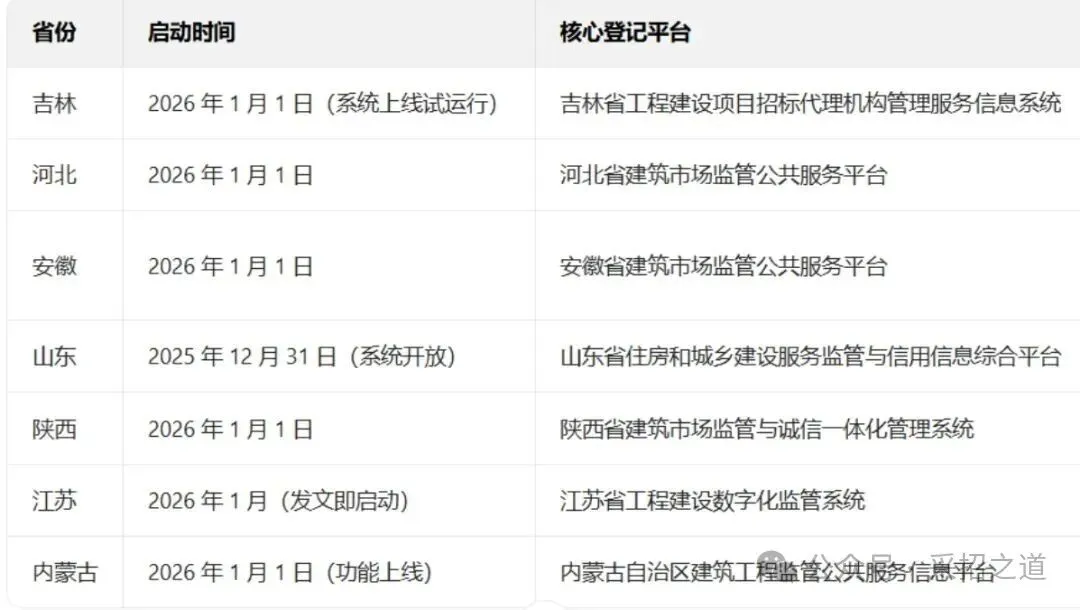 - 截至 2026 年 1 月 13 日,已明确开启招标代理机构在《全国建筑市场监管公共服务平台》登记工作(含省级平台已上线并可推送至全国平台)的省份及相关信息如下