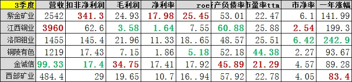 它们分别是紫金矿业、江西铜业、洛阳钼业、铜陵有色、金诚信、西部矿业。紫金矿业净利润和净利率做的非常不错,成本优势明显,roe也是最高的。江西铜业总营收最高,规模优势比较大,缺点是毛利润太低了。估值方面,铜陵有色的市盈率断崖式领先。洛阳钼业的市净率和年涨幅则领先。1、紫金矿业