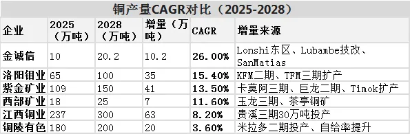 铜产量:109万吨(2025)→150万吨(2028),CAGR 13.5%增量来源:卡莫阿三期(+2万吨)、巨龙二期(+11万吨)、Timok扩产(+3万吨)金产量:90吨(2025)→110吨(2028),CAGR 7.0%增量来源:RG金矿、陇南紫金、哥伦比亚武里蒂卡扩产锂产量:12万吨(2025)→30万吨(2028),CAGR 47.6%增量来源:阿根廷3Q盐湖、西藏拉果错、湖南湘源全产业链二、江西铜业