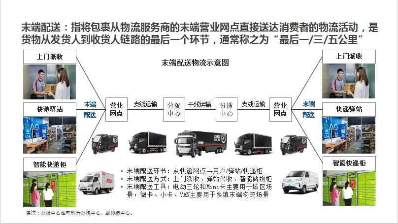 末端配送:指将包裹从物流服务商的末端营业网点直接送达消费者的物流活动,是货物从发货人到收货人链路的最后一个环节,通常称之为“最后一/三/五公里”。