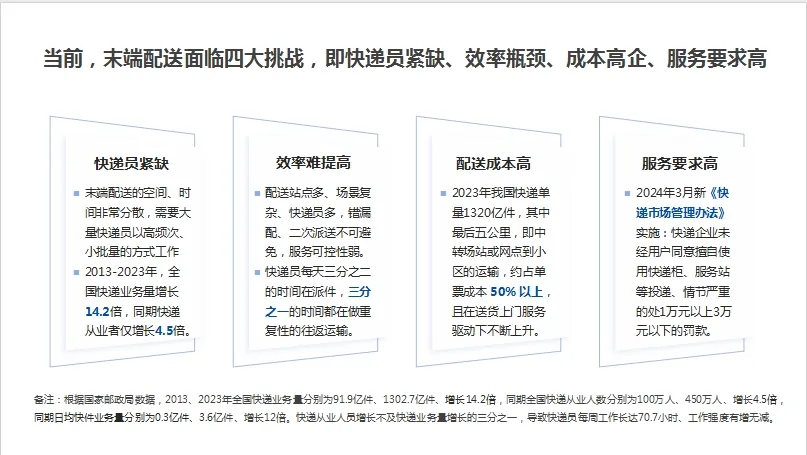 当前,末端配送面临四大挑战,即快递员紧缺、效率瓶颈、成本高企、服务要求高。