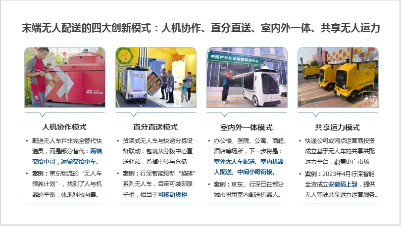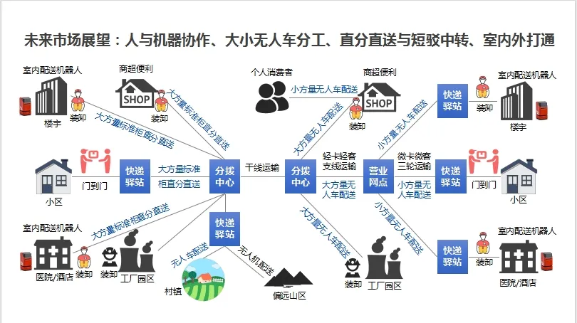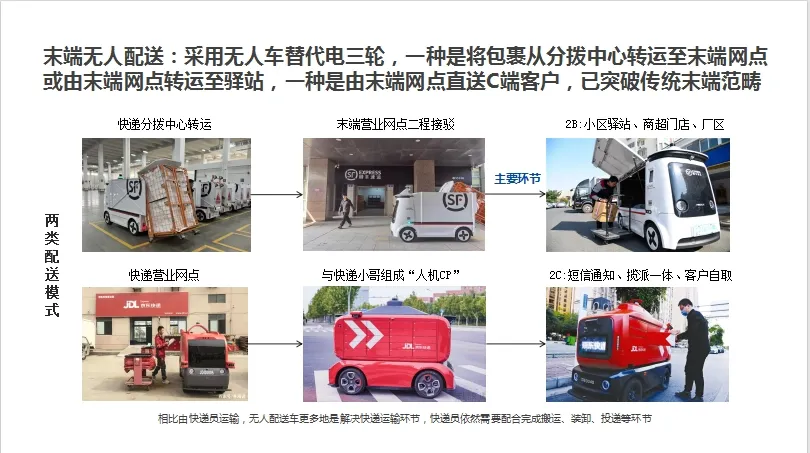 末端无人配送:采用无人车替代电三轮,一种是将包裹从分拨中心转运至末端网点或由末端网点转运至驿站,一种是由末端网点直送C端客户,已突破传统末端范畴。