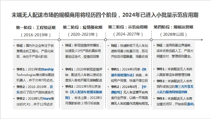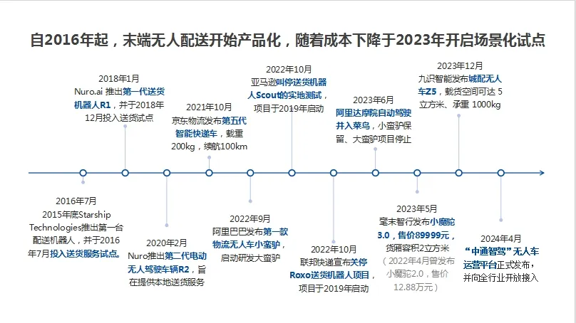自2016年起,末端无人配送开始产品化,随着成本下降于2023年开启场景化试点。
