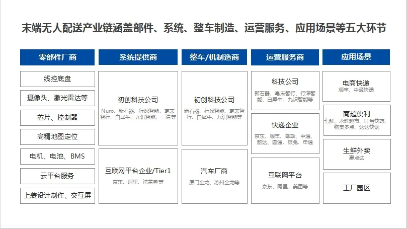 末端无人配送产业链涵盖零部件、自动驾驶系统、整车/机制造、运营服务、应用场景等五大环节。
