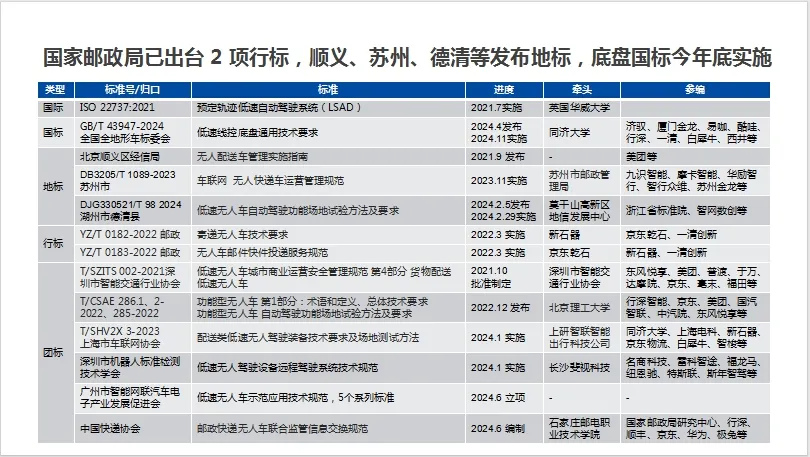 2024年5月,安徽省邮政局组织组织召开《安徽省快递物流无人化应用场景试点工作方案(讨论稿)》工作座谈会;2024年6月,《北京市自动驾驶汽车条例(征求意见稿)》公开征集意见,明确功能型无人车创新活动期间应当按照国家和本市有关规定通行。支持建设功能型无人车所需的停车位、交付设施、公共充电设施。