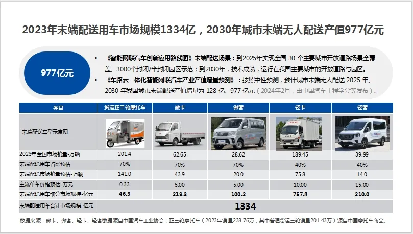 2023年末端配送用车市场规模1334亿、153.7万辆,包含了货运正三轮摩托车、微卡、微客、轻卡、轻客等。