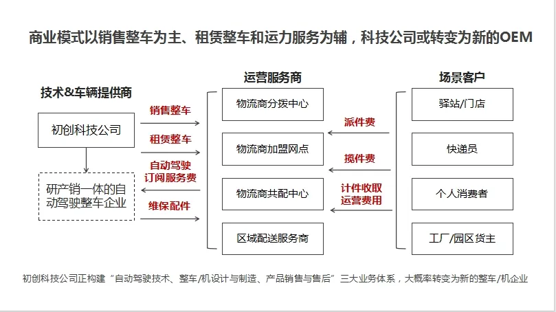商业模式以销售整车为主、租赁整车和运力服务为辅,科技公司或转变为新的OEM。