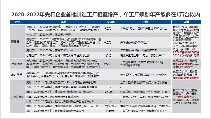 2020-2022年先行企业首批制造工厂相继投产,单工厂规划年产能多在1万台以内。