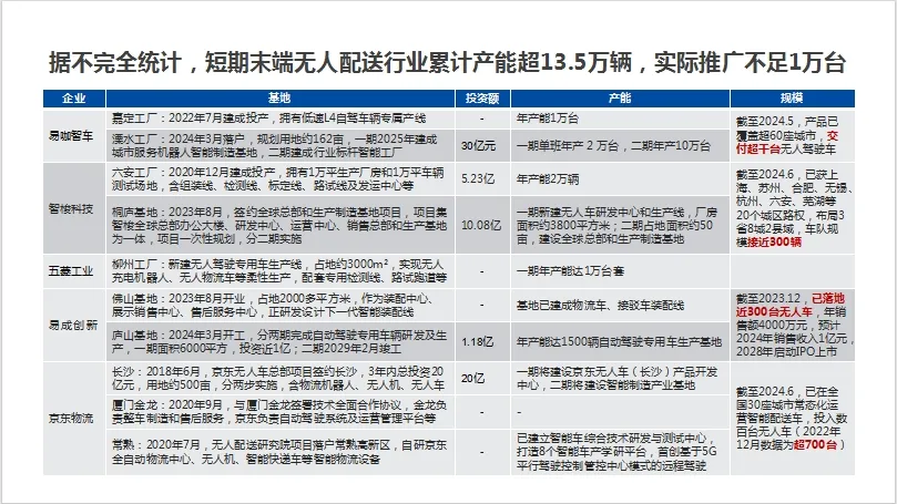 据不完全统计,短期末端无人配送行业累计产能超13.5万辆,实际推广不足1万台。