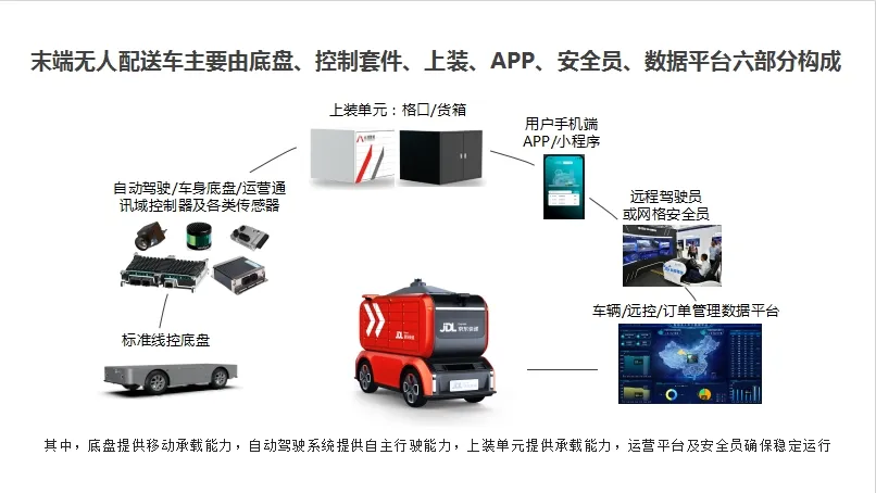 末端无人配送车主要由线控底盘、整车控制套件、上装单元、用户端APP/小程序、现场/远程驾驶安全员、云端数据平台六部分构成。