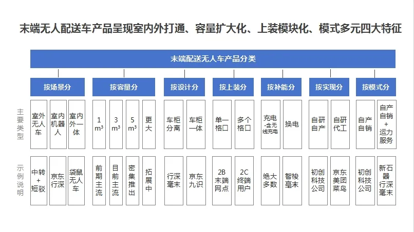 末端无人配送车产品可以按场景、容量、设计、上装、补能、落地、模式分,可以看到随着场景化测试和示范区域的扩大化,末端无人配送车产品品类急速拓展,产品实现方式多元化,如何将产品功能与场景需求耦合起来,并不断提高运力网络与人机协作系统的运营效率,将是未来几年业内企业要解决的核心问题。