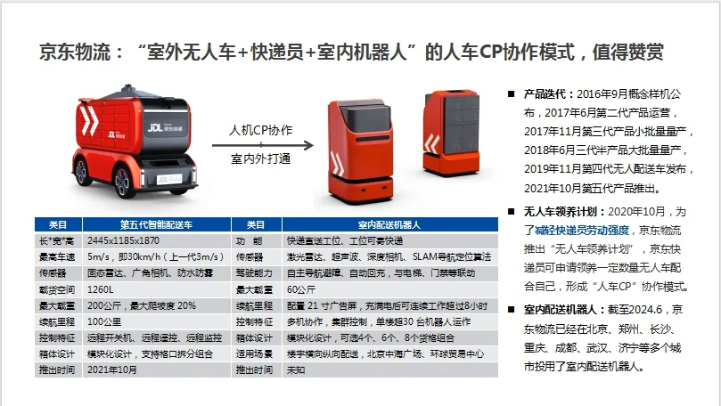 人机协作模式:配送无人车并非完全替代快递员,而是部分替代:两端交给小哥,运输交给小车。