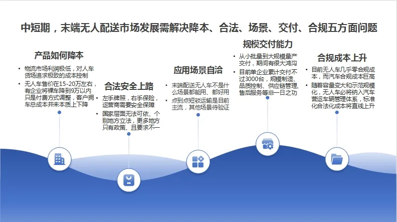 应用场景自洽:末端配送无人车不是什么场景都能用、都好用。点到点短驳运输是目前主流,其他场景待验证。