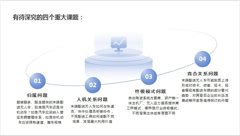 竞合关系问题:末端配送无人车可能实质上将形成对微卡、微客、轻卡、轻客等现有配送车辆的部分替代趋势,对其背后企业的长远发展战略而言是值得探讨的问题。