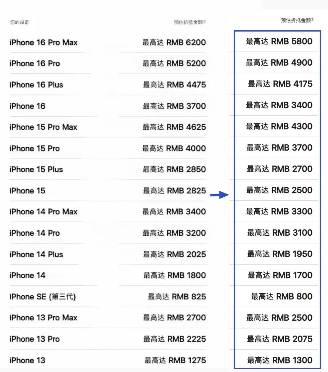 今天苹果官网更新了 Apple Trade In 换购计划的旧设备折抵价格,几乎所有可以在官网折抵换购的旧设备的折抵金额都出现了一定程度的下调。通过之前的预估折抵价格和最新预估折抵价格对比,可以发现价格下调最多的是上一代旗舰 iPhone 16 Pro Max 机型,最高折抵价格下调了 400 元。价格下调最少的是 iPhone SE 第三代,最高折抵价格仅仅下调了 25 元。有意思的是,iPhone 13 标准版是一个例外,这款机型的最高折抵价格居然还上调了 25 元,可以多买两个大鸡腿了。其实苹果官网的旧设备折抵价格不定期下调也是很正常的,毕竟电子产品一直在不断贬值。对于选择在苹果官网或者线下 Apple Store 直营店折抵换购的小伙伴来说,主要是图个省心省事。因为在官网以旧换新的话,手上的旧 iPhone 边框有磕碰或者屏幕有轻微划痕,甚至是部分小部件比如听筒、扬声器、振动马达失灵也不会影响折旧价格。如果你家附近正好有 Apple Store 直营店的话,直接拿旧设备去现场估价折抵换购新 iPhone 就行,非常快速方便。当然,如果你不嫌麻烦的话,在闲置平台出售给个人的价格大概率会比官方折抵价格高不少。如果交易顺利还好,但如果遇到名堂比较多的买家,可能会麻烦一些。所以苹果官网的折抵换购仅适合不嫌麻烦,并且不是很在意折旧价格的用户。2026最全的手机报价,最新iphone新闻请关注雅妹儿微信号:1018817036 <--- 长按可复制到微信添加关注