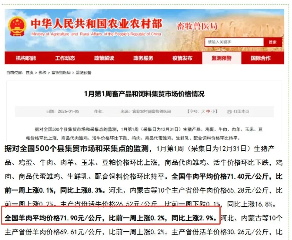 一边是2026年1月1日澳大利亚羊肉对华出口零关税政策正式落地,本以为会迎来降价潮;另一边却是进口羊肉价格连创新高,旺季备货季的市场表现超出预期。这背后究竟发生了什么?进口羊肉涨价会持续到%,持续刷新2024年以来的价格峰值。这一涨幅远超国内羊肉市场的整体波动水平——农业农村部监测显示,2026年1月第一周全国羊肉平均价格为71.90元/公斤,同比仅上涨2.9%。