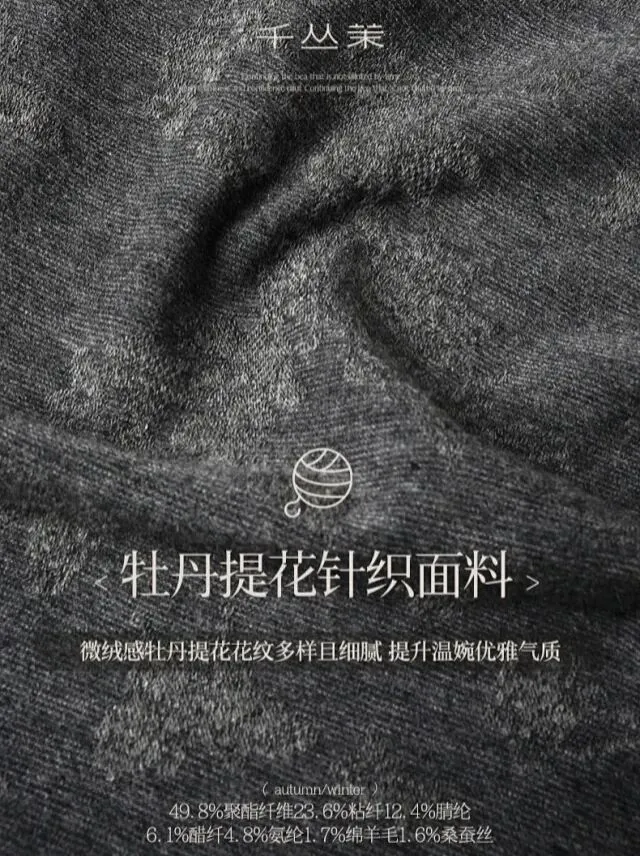 牡丹提花针织的面料,含少量羊毛和桑蚕丝