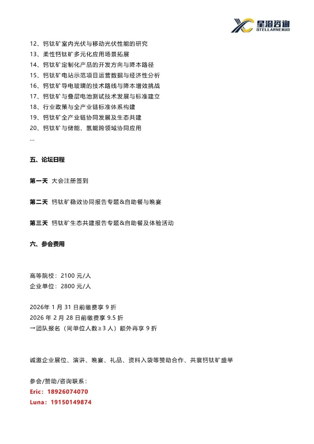 钙钛矿工厂(星澄咨询)定于2026年3月18-19日举办2026年钙钛矿与钙钛矿叠层电池产业融合发展论坛。同期将参观尚柔新能源百兆瓦柔性钙钛矿太阳能电池生产线!(参观同期开放AM0级空间环境测试中心与AM1.5级地面光伏测试中心)。本届论坛将主题明确锚定为“稳效协同”与“合纵共建”。我们诚挚地邀请您——无论是深耕多年的产业巨头,还是锐意创新的技术先锋,或是化为普照世界的“朝阳”。