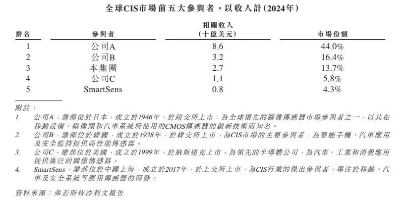 根据弗若斯特沙利文的资料,按2024年图像传感器解决方案收入计,豪威集团排名全球第三,市场份额为13.7%,仅次于日本索尼(44.0%)、韩国三星(16.4%);是全球第三大的智能手机CIS供应商,市场份额10.5%;是全球最大的汽车CIS供应商,市场份额32.9%。