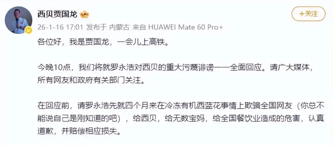 西贝贾国龙今天突然在朋友圈控诉罗永浩对西贝的伤害。