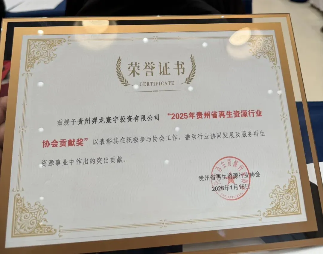 潮平岸阔催人进,风正扬帆正当时。此次荣获“2025年度贵州省再生资源行业协会贡献奖”,是羿龙寰宇发展历程中的重要里程碑,更是企业开启绿色发展新征程的崭新起点。在政策红利持续释放、行业前景日益广阔的背景下,相信羿龙寰宇将以更加坚定的信念、更加务实的举措、更加创新的精神,深耕再生资源产业,引领行业发展潮流,在推动区域循环经济高质量发展的道路上续写更加辉煌的篇章,为贵州“无废城市”建设与绿色生态强省建设注入源源不断的动力。