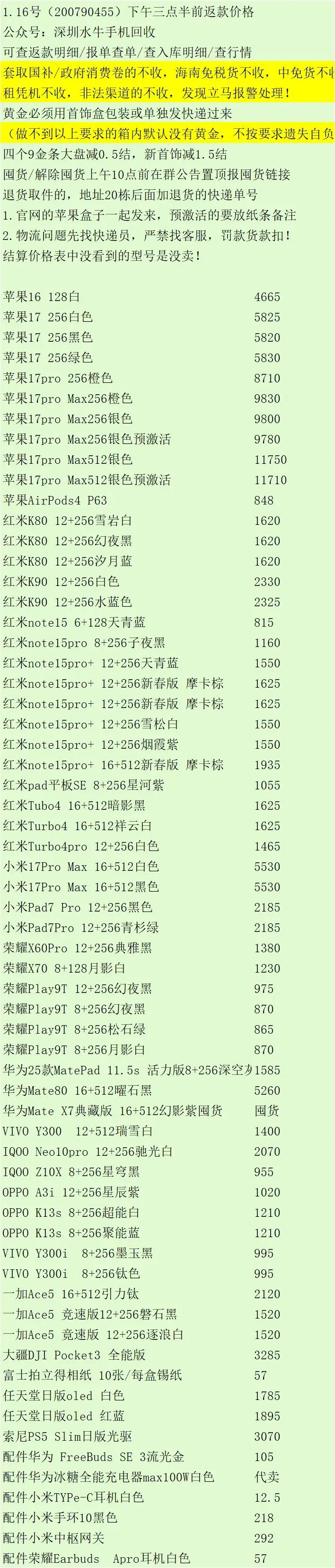 返款价格上面没有的型号颜色也收,当天有到的才有出结算价格。