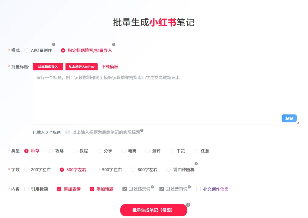这里要重点说下批量生成功能的优势:不仅能自定义笔记风格(种草、测评、干货等),还能模仿对标账号的语气,新手不用再纠结“怎么写才像行业内的人”,直接一键复刻优质调性。