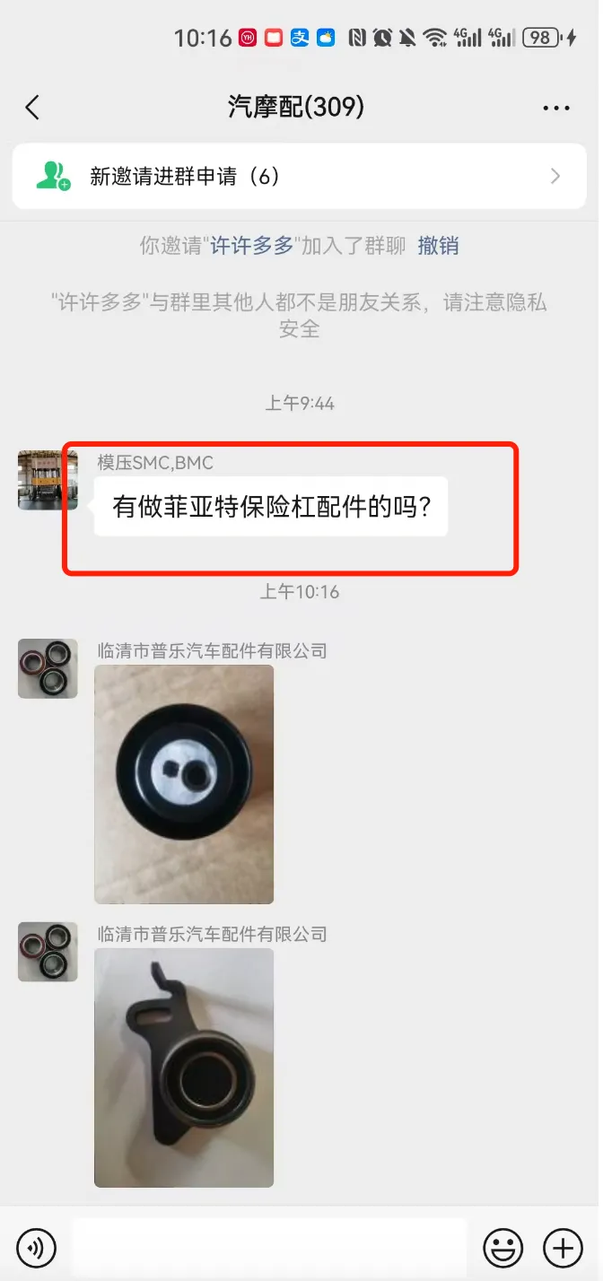 汽车配件群里可以发布的信息:外贸采购信息、产品销售信息,文字、图片、视频都可以,控制广告频率,不能刷屏广告。