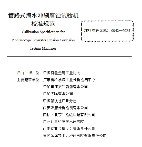 近日,广州计量院(GIMT)参与起草的行业计量技术规范JJF(有色金属)0042-2025《管路式海水冲刷腐蚀试验机校准规范》,随工业和信息化部2025年第41号公告正式发布,将于2026年5月1日起实施。该规范填补了我国相关设备校准领域的行业标准空白,为有色金属行业高质量发展提供有力计量技术支撑。