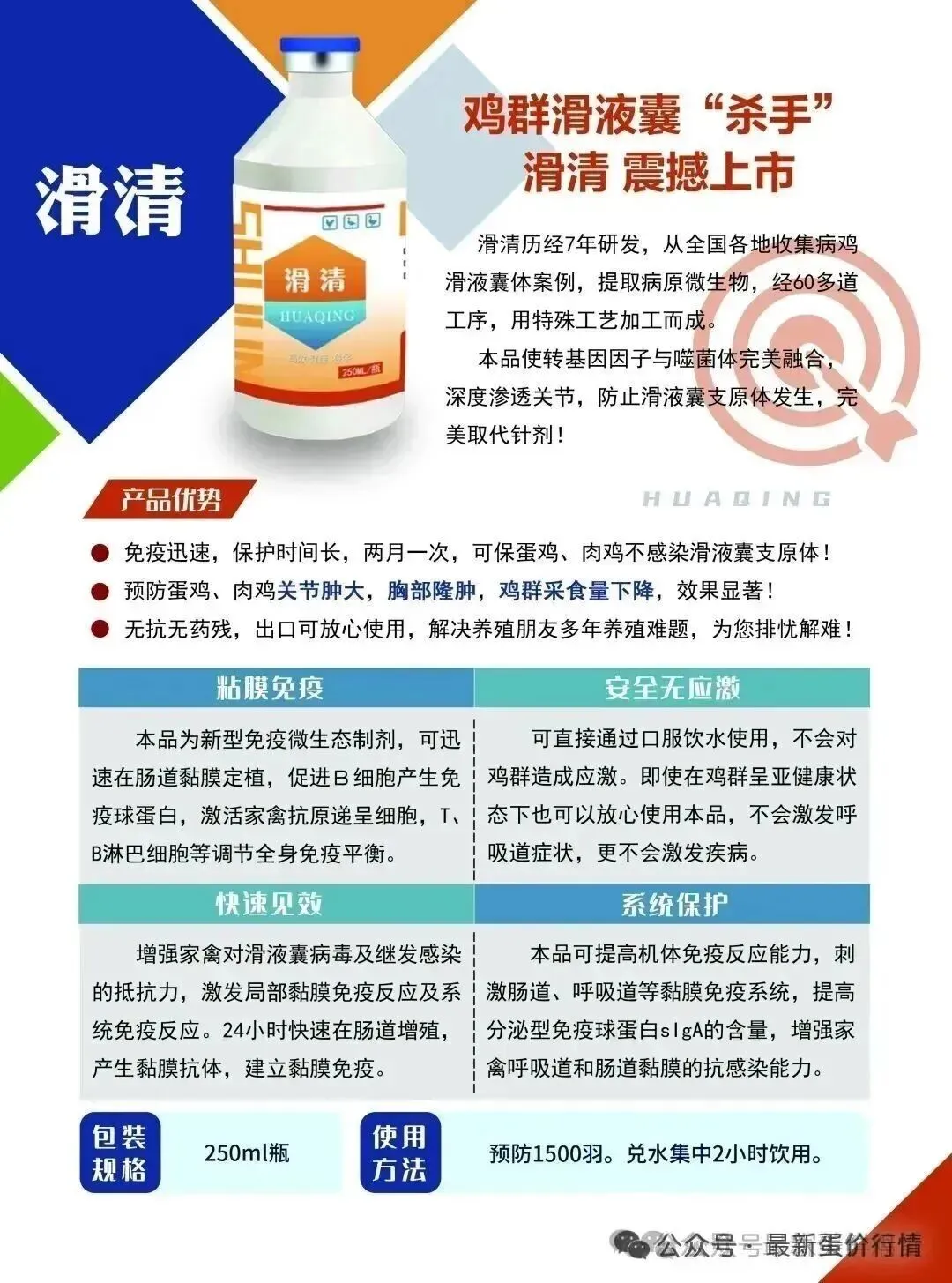 总结本产品:滑清,预防用一天一瓶针对1500只蛋鸡,治疗一瓶管800-1000只蛋鸡,使用两天快速控制,用完一个疗程快速改善蛋壳恢复产蛋。