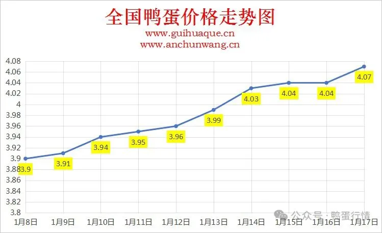 2026年1月17日全国鸭蛋价格行情快递:多地上涨,今日全国鸭蛋均价4.07元/斤。