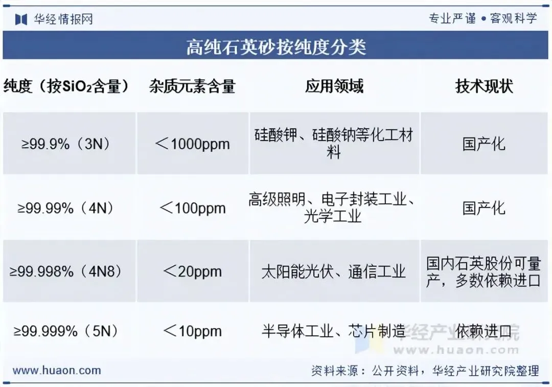高纯石英砂指SiO2纯度极高、杂质元素含量极低的石英微粉,通常由高品质的天然石英矿物通过物理化学技术提纯后生产。高纯石英砂是一种重要的非金属矿产资源,因其高纯度、高硬度、高耐火性、低热膨胀系数等优异特性,在高科技领域有着广泛应用。高纯石英砂各纯度标准产品应用领域不同,价格差异大。按应用市场分类:4N级产品主要应用于高级照明、电子封装工业等领域;4N8级产品主要用于光伏、通信工业领域;5N级产品则主要应用于半导体、芯片制造领域。
