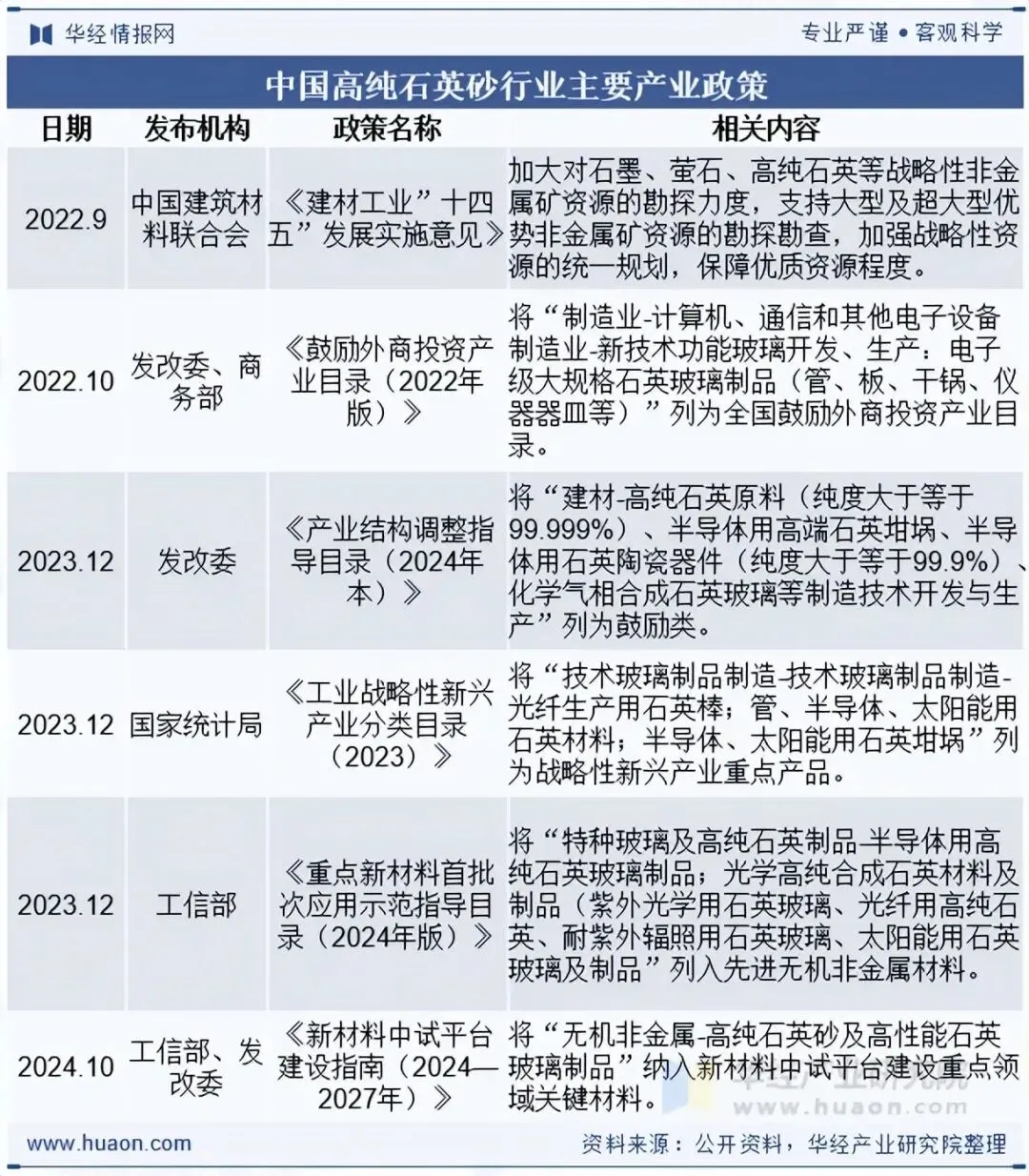 我国已经充分意识到高纯石英砂对国民经济发展的重要性,并将高纯石英砂行业列为国家重点发展的行业之一。部分政策的制定和颁布均体现了国家对高纯石英砂行业的鼓励和支持,如《新材料中试平台建设指南(2024—2027年)》将“无机非金属-高纯石英砂及高性能石英玻璃制品”纳入新材料中试平台建设重点领域关键材料。在如此良好的政策环境中,高纯石英砂行业必将迎来高速发展的黄金时期。