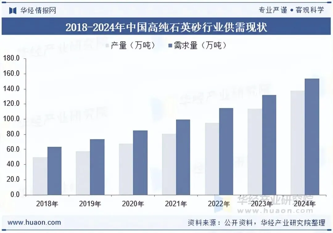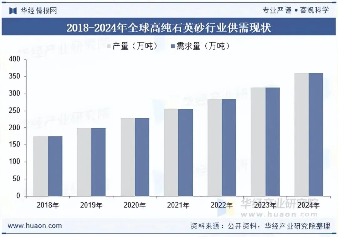 由于高纯石英砂的提纯制备对原料矿石质量要求较高,全球符合质量要求的高纯石英原料矿床稀少。近年来,电子工业的发展推动了全球高纯石英砂产业的增长,据统计,2024年全球高纯石英砂产量为361.1万吨,需求量360.6万吨。