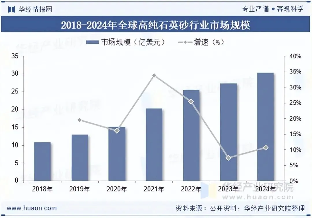 由于高纯石英砂的提纯工艺复杂,技术壁垒较高,目前全球仅有美国尤尼明、挪威TQC、中国石英股份三家企业具备高纯石英砂规模化量产技术和能力。从市场规模来看,近年来全球高纯石英砂市场规模稳定增长,从2018年的10.93亿美元增长至2024年的30.34亿美元,年复合增长率为18.5%。