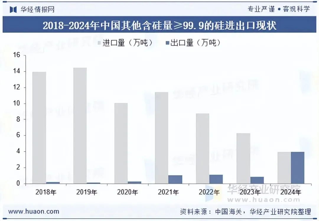 我国是高纯石英砂消费大国,也是全球第一大高纯石英砂进口国。整体而言,中低端产品能够自给,部分出口;高端产品仍主要依赖进口。目前,中国高纯石英4N8级别以上原料矿全部依靠进口。2018~2024年,中国从国外进口≥4N高纯石英3.98~13.96万吨,同期,中国出口≥4N高纯石英0.18~1.13万吨,除2021年、2022年与2024年外均在1万吨以下。