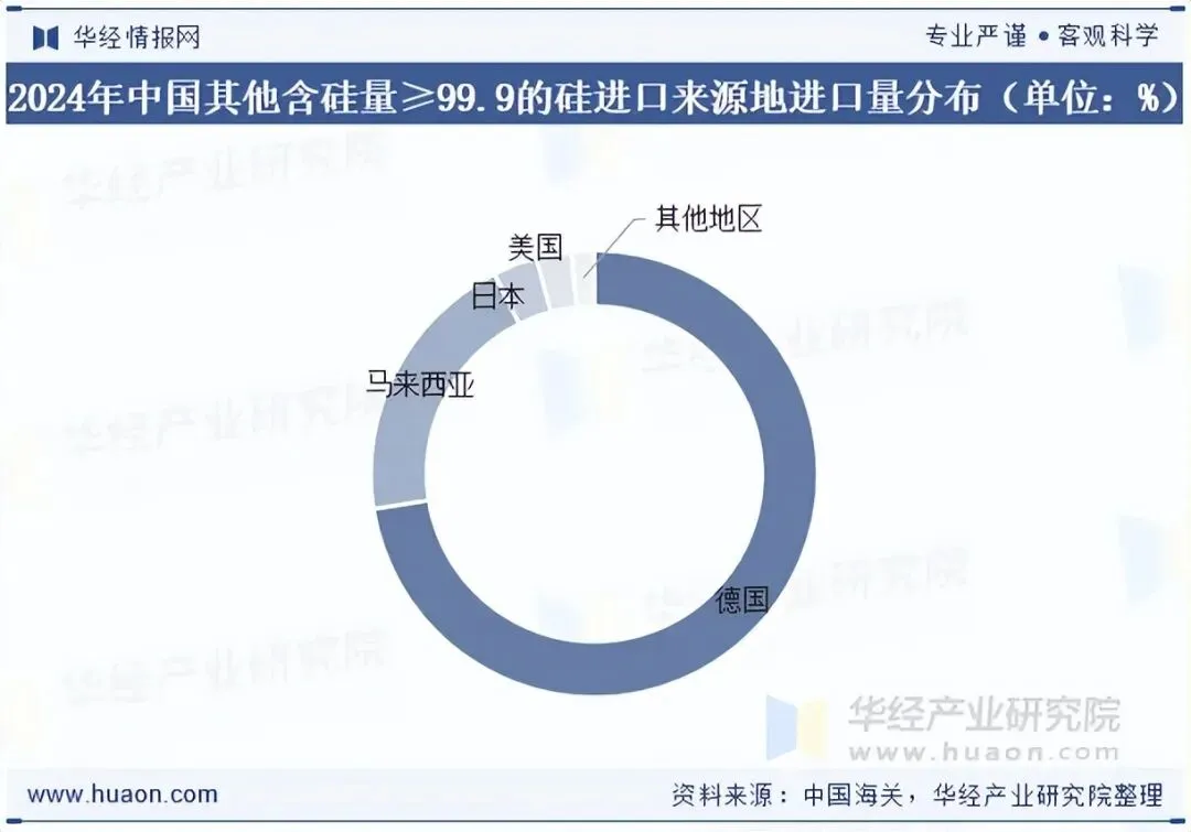 从我国其他含硅量≥99.9的硅进口来源地来看,2024年我国主要从德国、马来西亚、日本、美国进口,其中从德国进口其他含硅量≥99.9的硅2.89万吨,进口量合计占比72.5%,其他地区进口量合计占比27.5%。