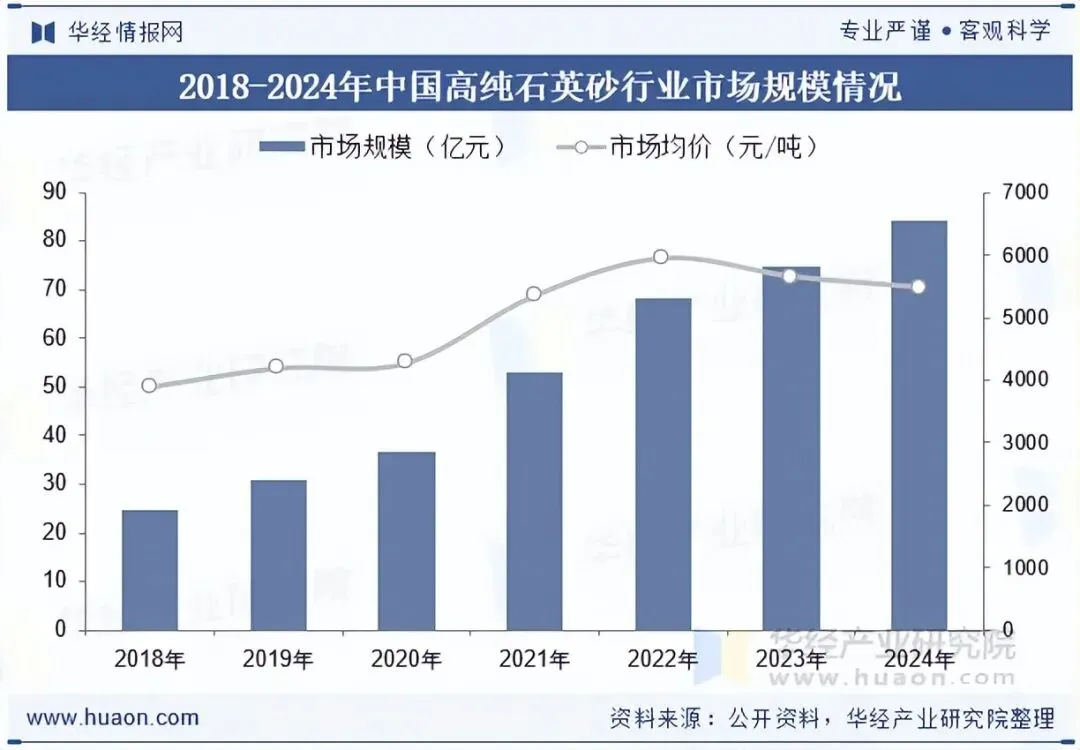 近年来我国光伏、半导体产业快速发展,光伏用高纯石英砂产业链已相对成熟,半导体用高纯石英砂仍处于刚刚起步阶段,市场规模来看,2024年我国高纯石英砂行业市场规模达到84.23亿元,近几年,国内高纯石英砂产品平均价格整体呈现上涨态势,2024年市场均价约为5480元/吨。