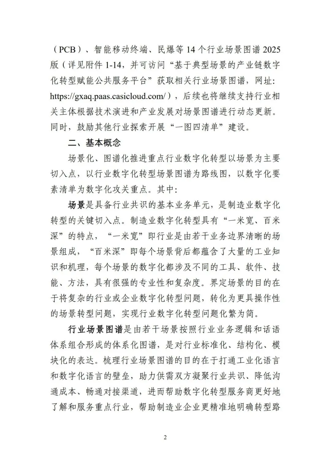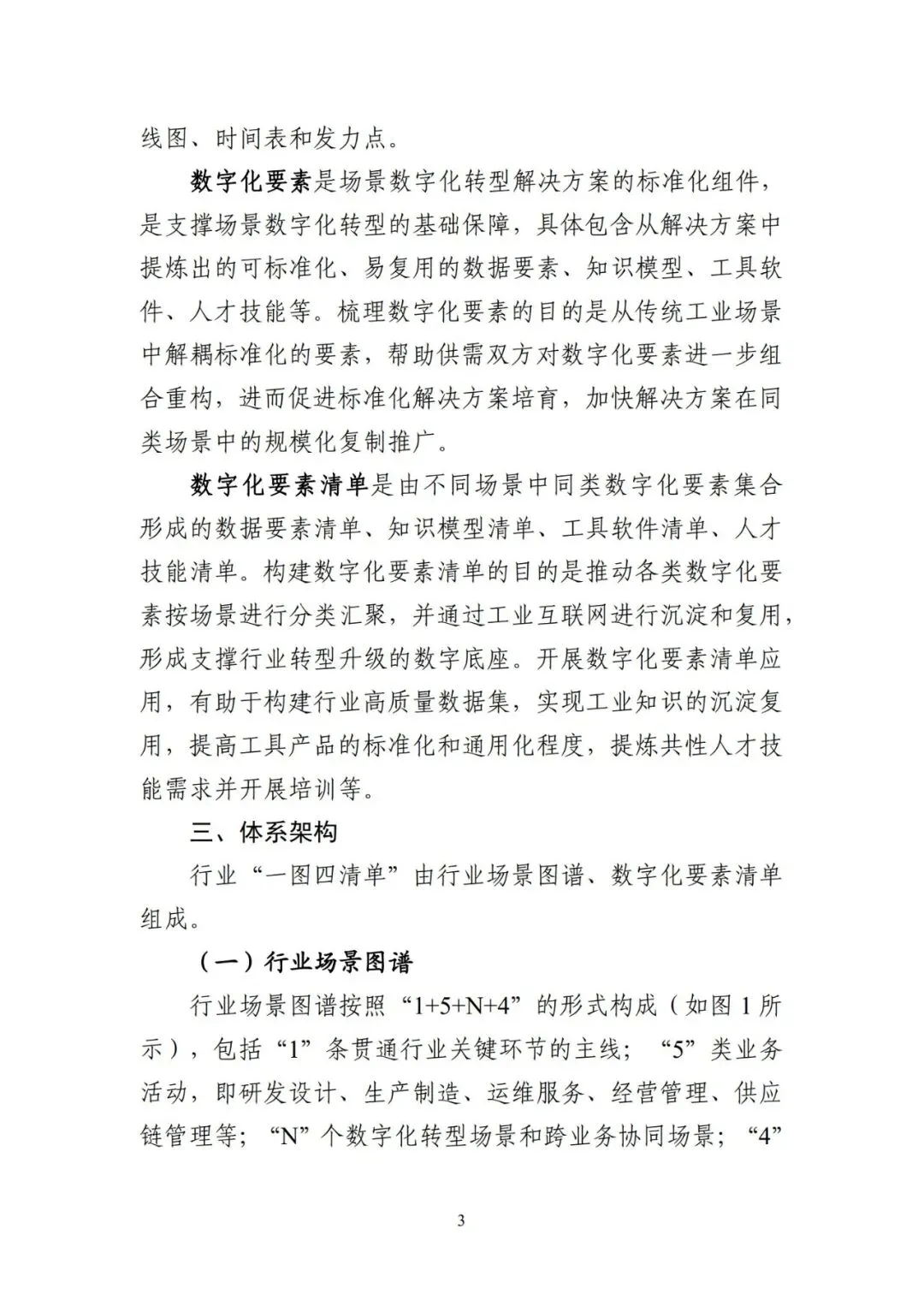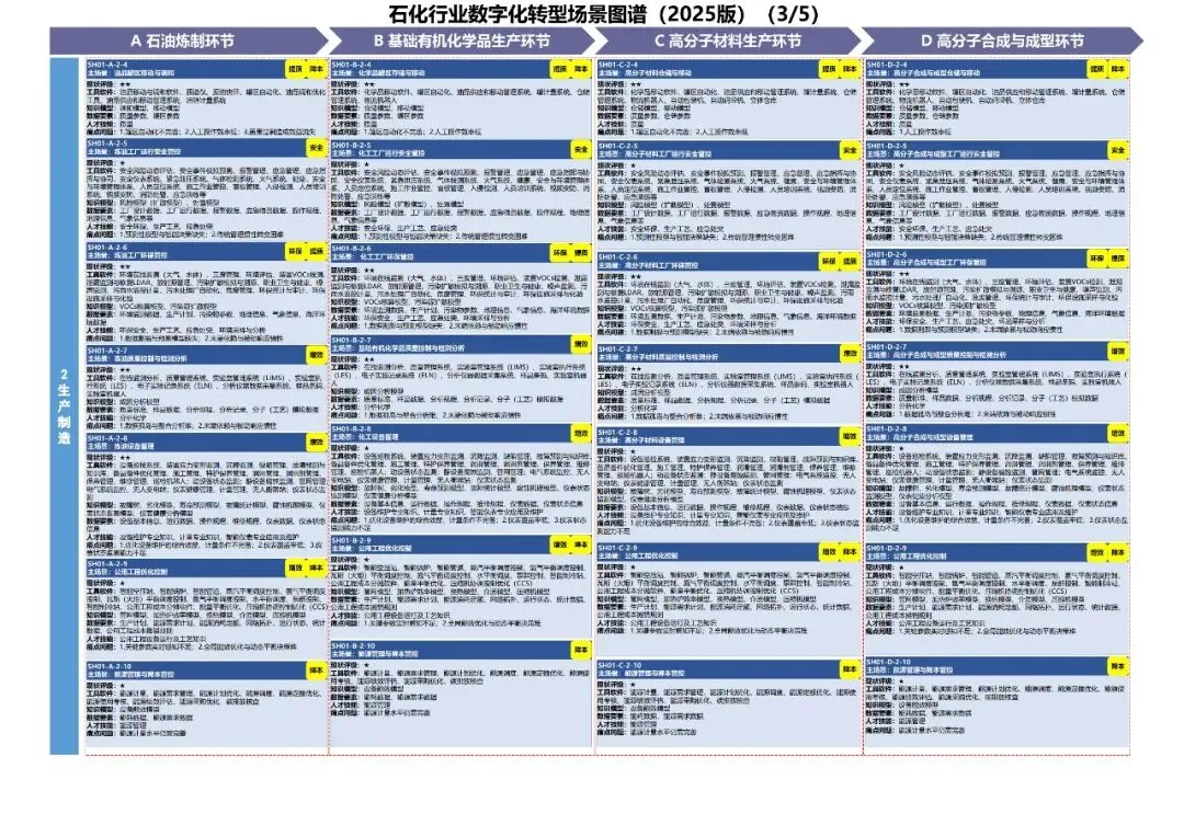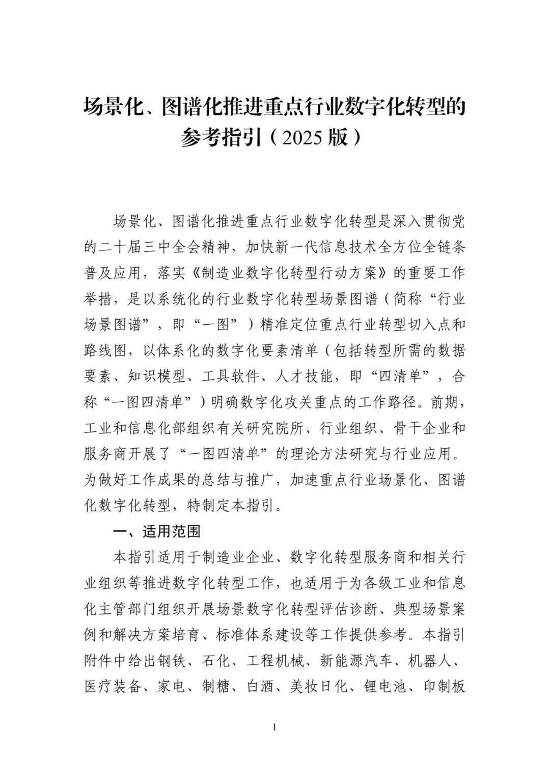 场景化、图谱化推进重点行业数字化转型是深入贯彻党 的二十届三中全会精神,加快新一代信息技术全方位全链条 普及应用,落实《制造业数字化转型行动方案》的重要工作 举措,是以系统化的行业数字化转型场景图谱(简称“行业 场景图谱”,即“一图”)精准定位重点行业转型切入点和 路线图,以体系化的数字化要素清单(包括转型所需的数据 要素、知识模型、工具软件、人才技能,即“四清单”,合 称“一图四清单”)明确数字化攻关重点的工作路径。前期, 工业和信息化部组织有关研究院所、行业组织、骨干企业和 服务商开展了“一图四清单”的理论方法研究与行业应用。 为做好工作成果的总结与推广,加速重点行业场景化、图谱 化数字化转型,特制定本指引。本指引适用于制造业企业、数字化转型服务商和相关行 业组织等推进数字化转型工作,也适用于为各级工业和信息 化主管部门组织开展场景数字化转型评估诊断、典型场景案 例和解决方案培育、标准体系建设等工作提供参考。本指引 附件中给出钢铁、石化、工程机械、新能源汽车、机器人、 医疗装备、家电、制糖、白酒、美妆日化、锂电池、印制板(PCB)、智能移动终端、民爆等 14 个行业场景图谱 2025版(详见附件 1-14,并可访问“基于典型场景的产业链数字 化转型赋能公共服务平台”获取相关行业场景图谱,网址:https://gxaq.paas.casicloud.com/),后续也将继续支持行业相 关主体根据技术演进和产业发展对场景图谱进行动态更新。 同时,鼓励其他行业探索开展“一图四清单”建设。场景化、图谱化推进重点行业数字化转型以场景为主要 切入点,以行业数字化转型场景图谱为路线图,以数字化要 素清单为数字化攻关重点。其中:场景是具备行业共识的基本业务单元,是制造业数字化 转型的关键切入点。制造业数字化转型具有“一米宽、百米 深”的特点,“一米宽”即行业是由若干业务边界清晰的场 景组成,“百米深”即每个场景背后都蕴含了大量的工业知 识和机理,每个场景的数字化都涉及不同的工具、软件、技 能、方法,具有很强的专业性和复杂度。界定场景的目的在 于将复杂的行业或企业数字化转型问题,转化为更具操作性 的场景转型问题,实现行业数字化转型问题化繁为简。行业场景图谱是由若干场景按照行业业务逻辑和话语 体系组合形成的体系化图谱,是对行业标准化、结构化、模 块化的表达。梳理行业场景图谱的目的在于打通工业化语言 和数字化语言的壁垒,助力供需双方凝聚行业共识、降低沟 通成本、畅通对接渠道,进而帮助数字化转型服务商更好地 了解和服务重点行业,帮助制造业企业更精准地明确转型路线图、时间表和发力点。数字化要素是场景数字化转型解决方案的标准化组件, 是支撑场景数字化转型的基础保障,具体包含从解决方案中 提炼出的可标准化、易复用的数据要素、知识模型、工具软 件、人才技能等。梳理数字化要素的目的是从传统工业场景 中解耦标准化的要素,帮助供需双方对数字化要素进一步组 合重构,进而促进标准化解决方案培育,加快解决方案在同 类场景中的规模化复制推广。