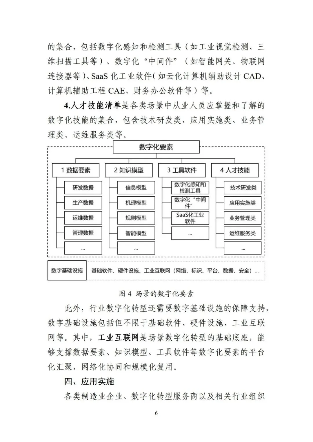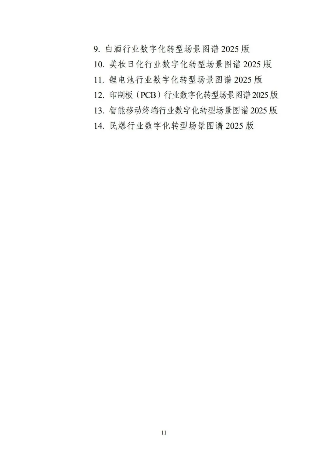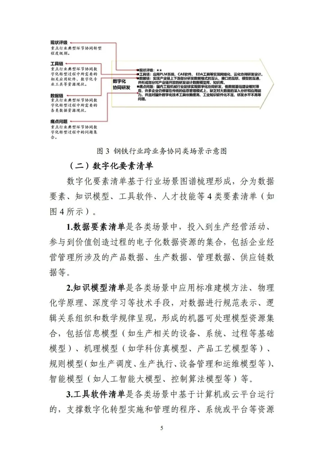 场景化、图谱化推进重点行业数字化转型是深入贯彻党 的二十届三中全会精神,加快新一代信息技术全方位全链条 普及应用,落实《制造业数字化转型行动方案》的重要工作 举措,是以系统化的行业数字化转型场景图谱(简称“行业 场景图谱”,即“一图”)精准定位重点行业转型切入点和 路线图,以体系化的数字化要素清单(包括转型所需的数据 要素、知识模型、工具软件、人才技能,即“四清单”,合 称“一图四清单”)明确数字化攻关重点的工作路径。前期, 工业和信息化部组织有关研究院所、行业组织、骨干企业和 服务商开展了“一图四清单”的理论方法研究与行业应用。 为做好工作成果的总结与推广,加速重点行业场景化、图谱 化数字化转型,特制定本指引。本指引适用于制造业企业、数字化转型服务商和相关行 业组织等推进数字化转型工作,也适用于为各级工业和信息 化主管部门组织开展场景数字化转型评估诊断、典型场景案 例和解决方案培育、标准体系建设等工作提供参考。本指引 附件中给出钢铁、石化、工程机械、新能源汽车、机器人、 医疗装备、家电、制糖、白酒、美妆日化、锂电池、印制板(PCB)、智能移动终端、民爆等 14 个行业场景图谱 2025版(详见附件 1-14,并可访问“基于典型场景的产业链数字 化转型赋能公共服务平台”获取相关行业场景图谱,网址:https://gxaq.paas.casicloud.com/),后续也将继续支持行业相 关主体根据技术演进和产业发展对场景图谱进行动态更新。 同时,鼓励其他行业探索开展“一图四清单”建设。场景化、图谱化推进重点行业数字化转型以场景为主要 切入点,以行业数字化转型场景图谱为路线图,以数字化要 素清单为数字化攻关重点。其中:场景是具备行业共识的基本业务单元,是制造业数字化 转型的关键切入点。制造业数字化转型具有“一米宽、百米 深”的特点,“一米宽”即行业是由若干业务边界清晰的场 景组成,“百米深”即每个场景背后都蕴含了大量的工业知 识和机理,每个场景的数字化都涉及不同的工具、软件、技 能、方法,具有很强的专业性和复杂度。界定场景的目的在 于将复杂的行业或企业数字化转型问题,转化为更具操作性 的场景转型问题,实现行业数字化转型问题化繁为简。行业场景图谱是由若干场景按照行业业务逻辑和话语 体系组合形成的体系化图谱,是对行业标准化、结构化、模 块化的表达。梳理行业场景图谱的目的在于打通工业化语言 和数字化语言的壁垒,助力供需双方凝聚行业共识、降低沟 通成本、畅通对接渠道,进而帮助数字化转型服务商更好地 了解和服务重点行业,帮助制造业企业更精准地明确转型路线图、时间表和发力点。数字化要素是场景数字化转型解决方案的标准化组件, 是支撑场景数字化转型的基础保障,具体包含从解决方案中 提炼出的可标准化、易复用的数据要素、知识模型、工具软 件、人才技能等。梳理数字化要素的目的是从传统工业场景 中解耦标准化的要素,帮助供需双方对数字化要素进一步组 合重构,进而促进标准化解决方案培育,加快解决方案在同 类场景中的规模化复制推广。