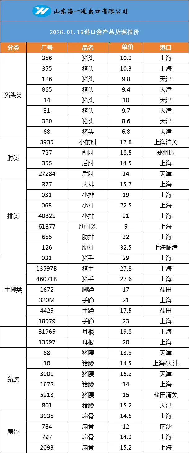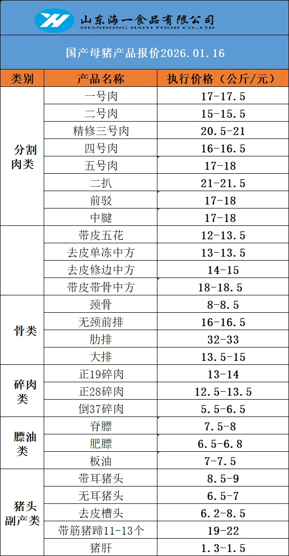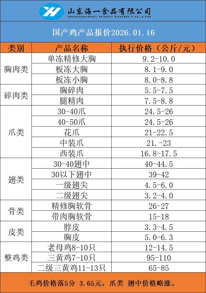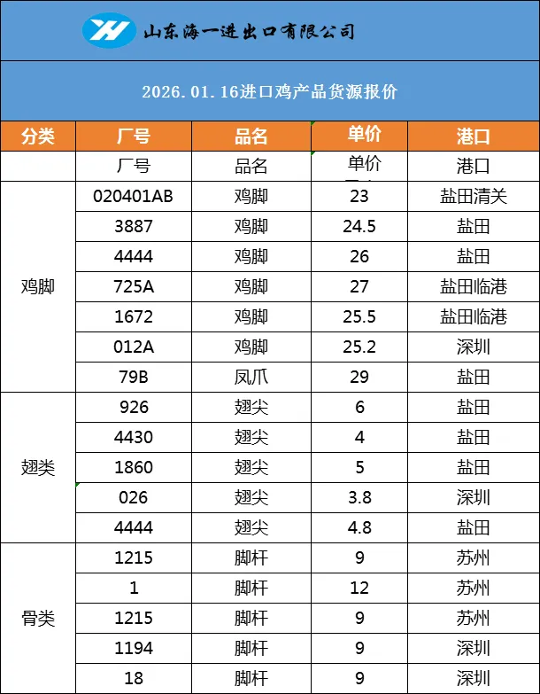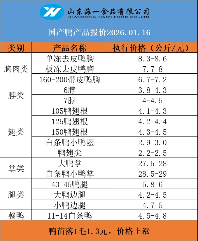 >海一食品1月16日,鸡、鸭、猪冻品价格分享