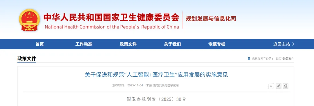 为贯彻落实国务院《关于深入实施“人工智能+”行动的意见》(国发〔2025〕11号),以新一代人工智能深度赋能卫生健康行业高质量发展,现就促进和规范“人工智能+医疗卫生”应用发展提出如下实施意见。