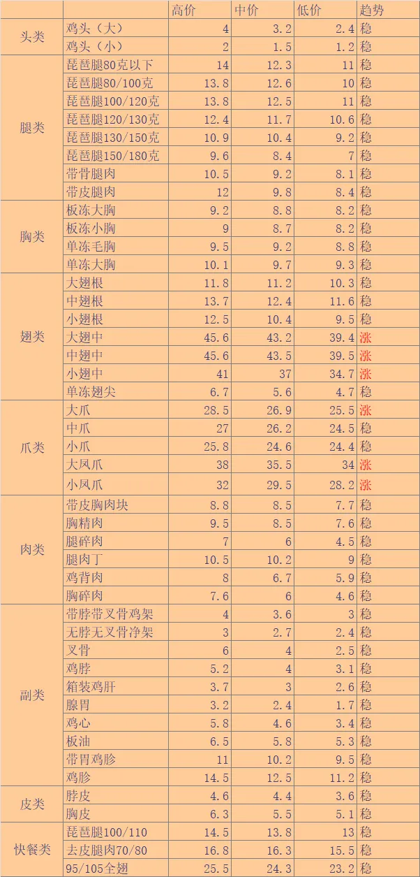 | 微评:今日大肉食毛鸡报价稳定。当前屠宰场成本高企,宰杀意愿不足。而产品端抗价观望,高价库存不愿亏损出手,预计短期偏弱势调整为主。注:各地毛鸡以实际成交为准,其中活禽交易价格差异大。实际局部根据产品行情、消费、毛鸡出栏现状分析,实际收购价格与报价有一定差距,价格只供参考。 |