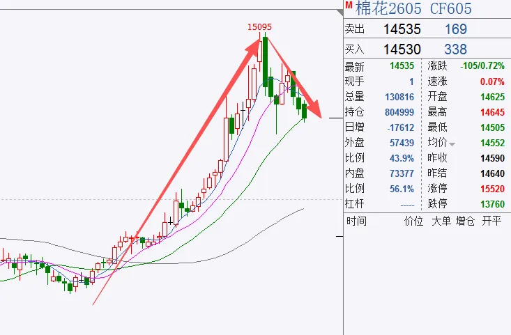 在14000–14200区域分批布局CF2605多单,止损参考13800下方,目标15000–15200。产业套保:有利润时,考虑盘面卖出,提前锁定销售价格,防止节后回落。