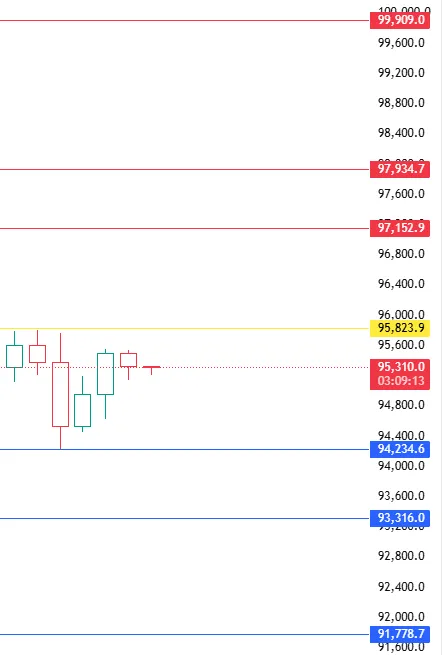 如果今天4小时级别反弹上不去95800这个位置上方.那4小时级别还会继续走回调.留意下方这几个支撑位置附近94200-93300-91780