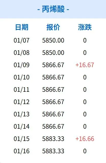 丙烯酸近十日价格呈现上涨趋势,上涨日为1月9日、15日。