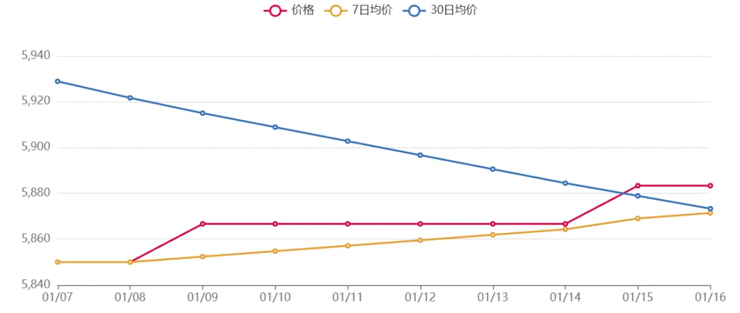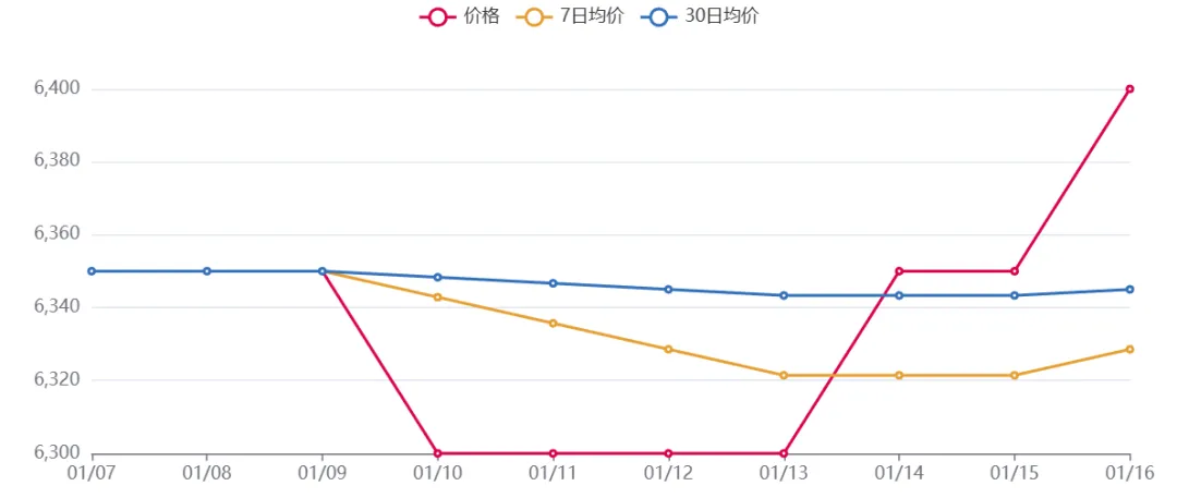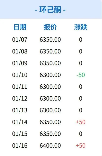 环己酮近十日价格呈现先下跌后上涨趋势,下跌日为1月10日,上涨日为1月14日、16日。