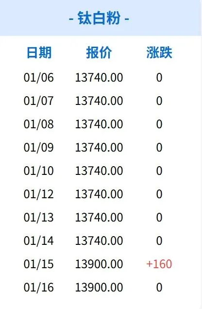 钛白粉近十日价格呈现上涨趋势,上涨日为1月15日。